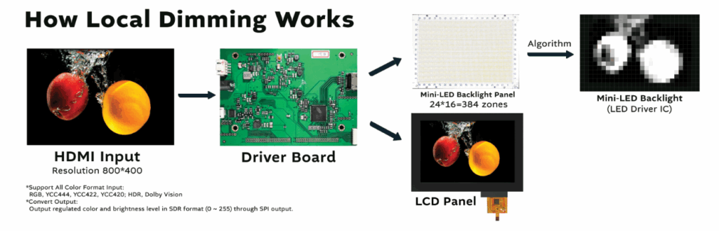 At EB-LCM, our Mini-LED display modules offer true local dimming, which means each backlight zone can be individually controlled.